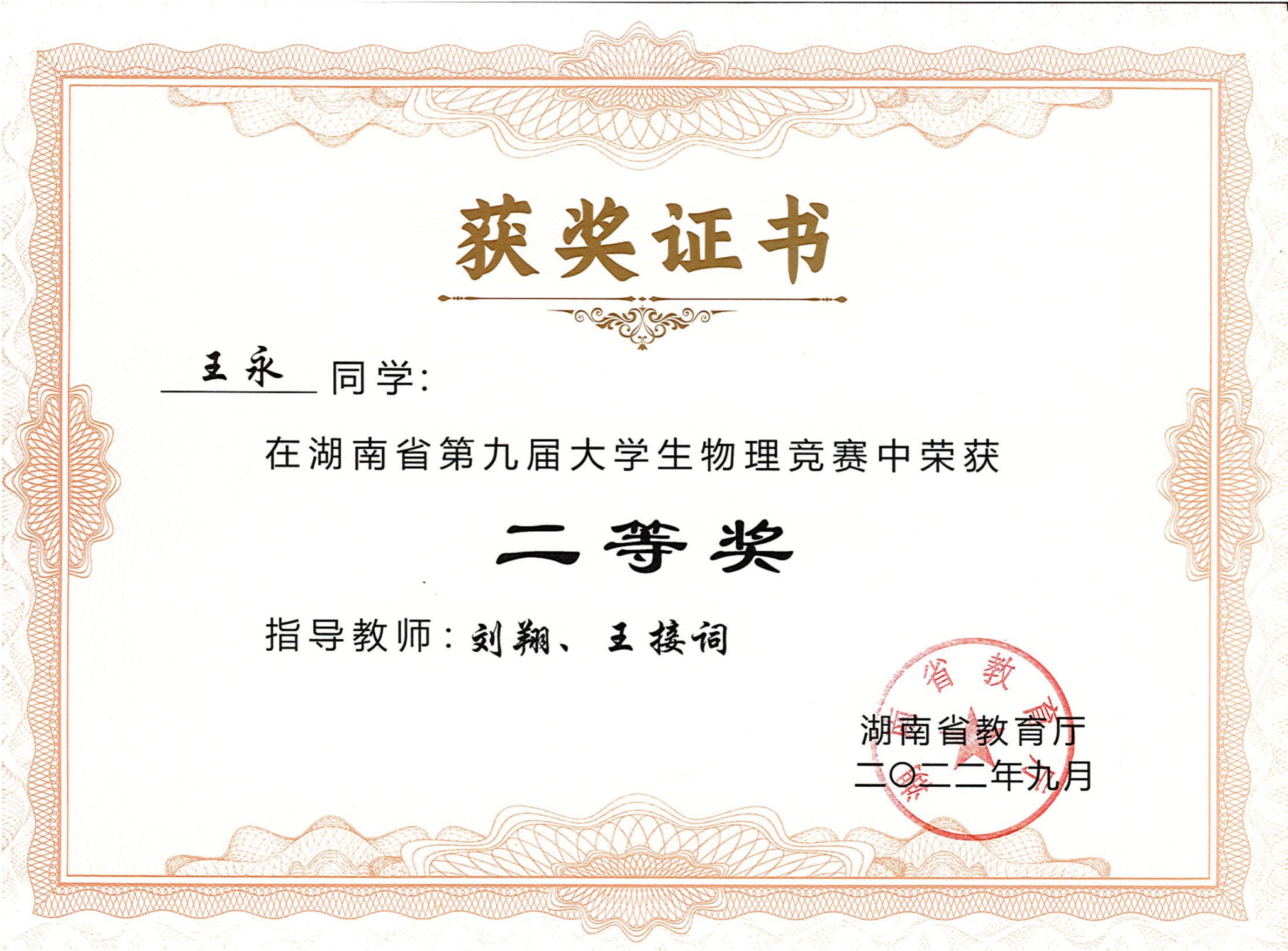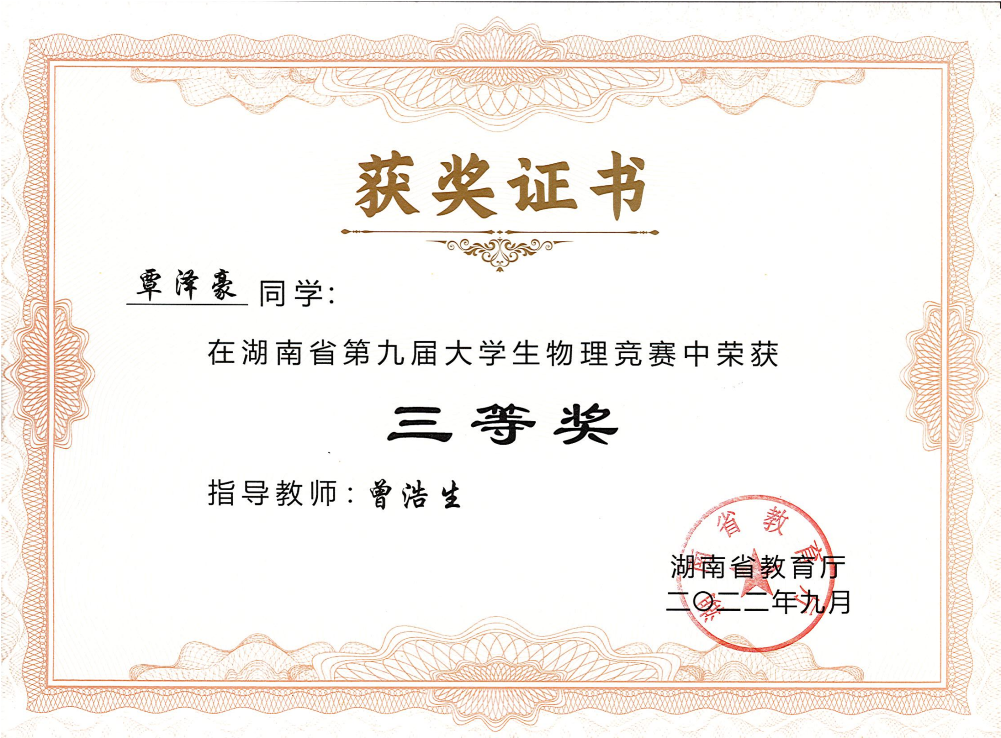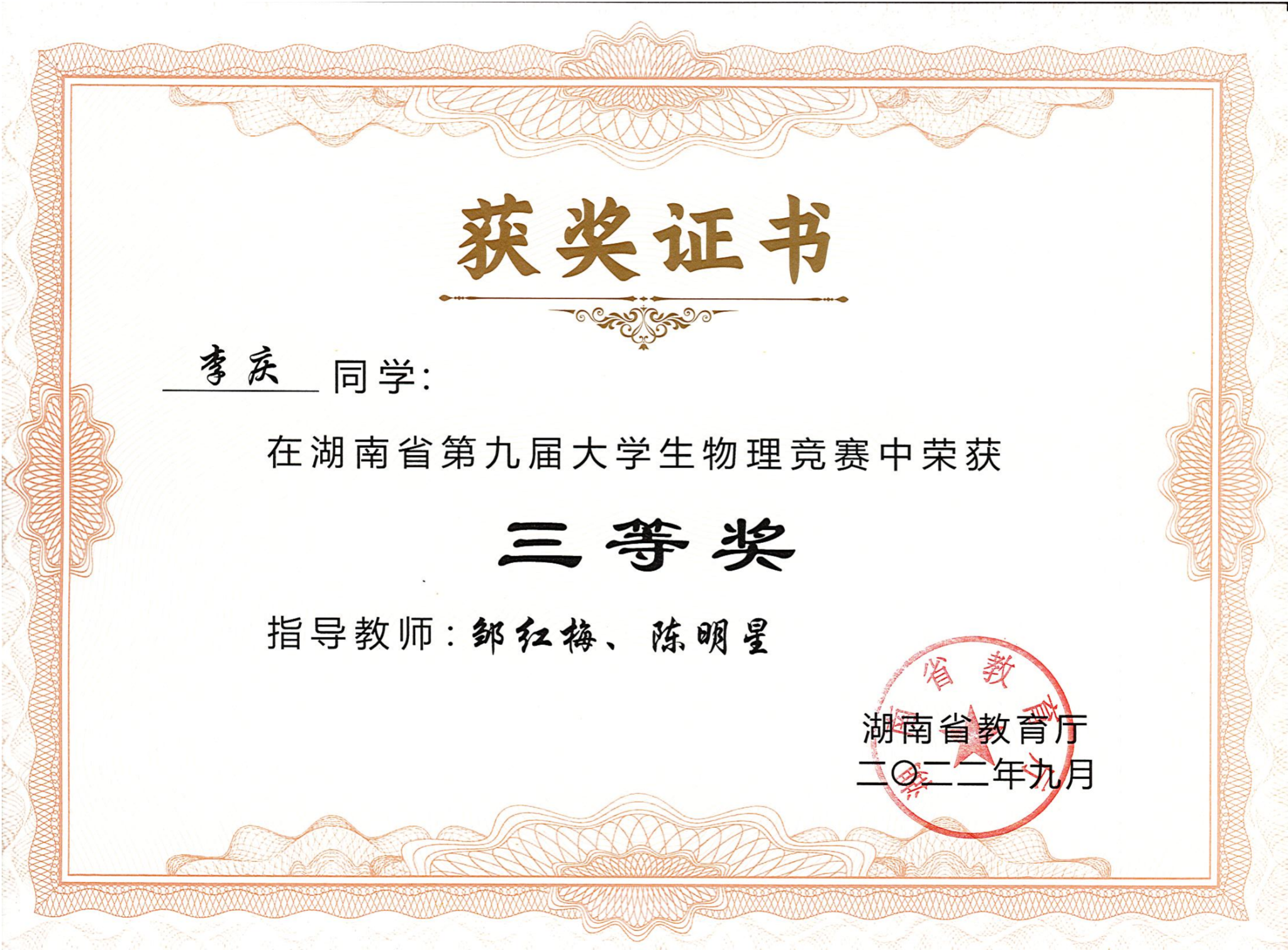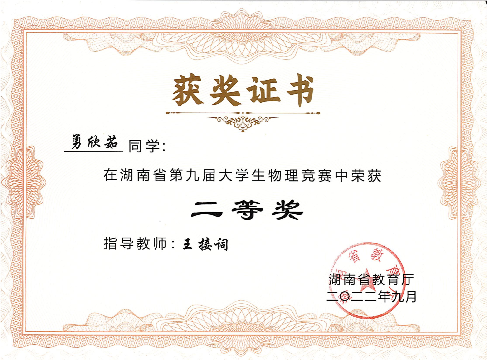 2022年湖南省第九届大学生物理竞赛获奖