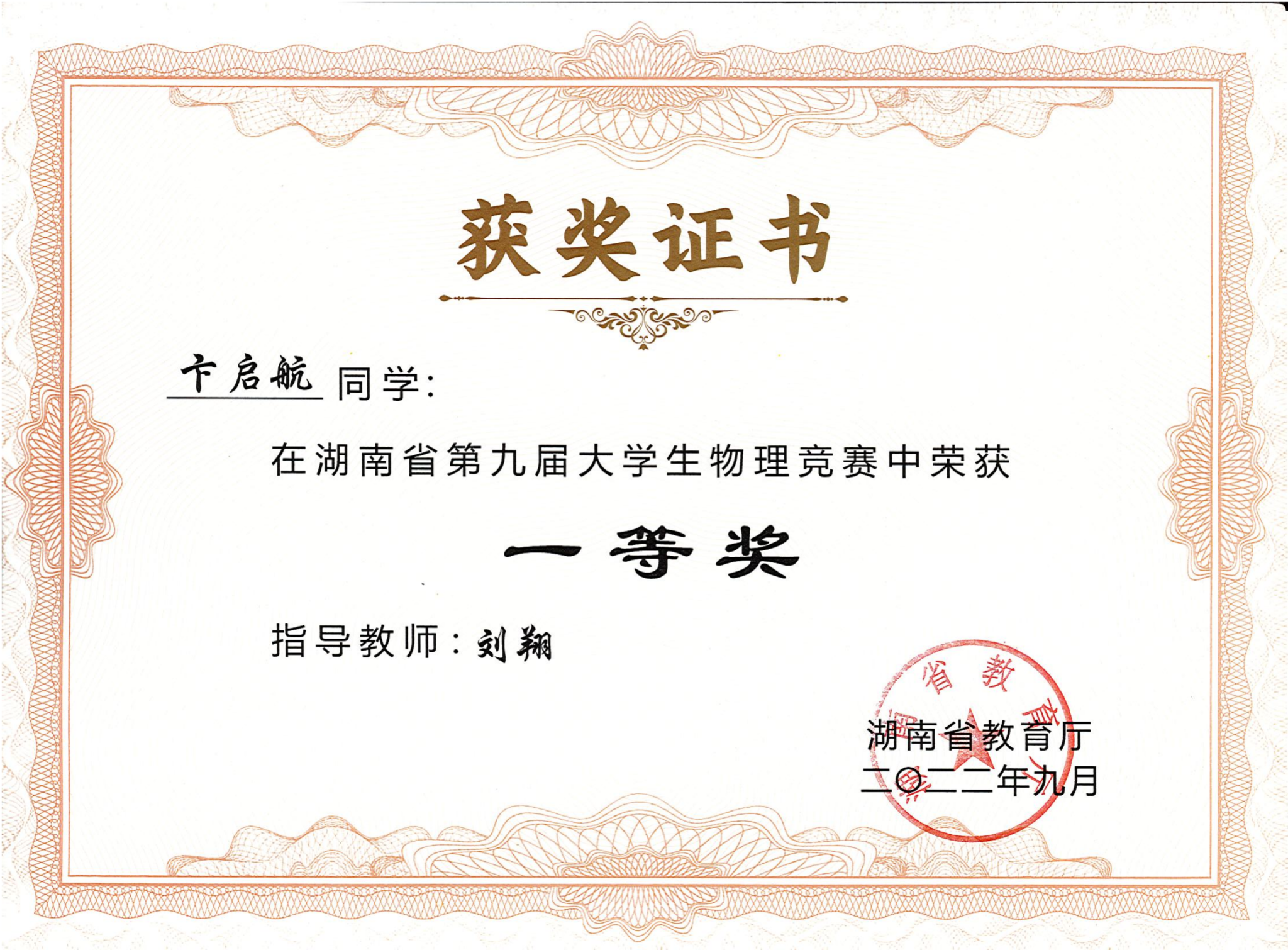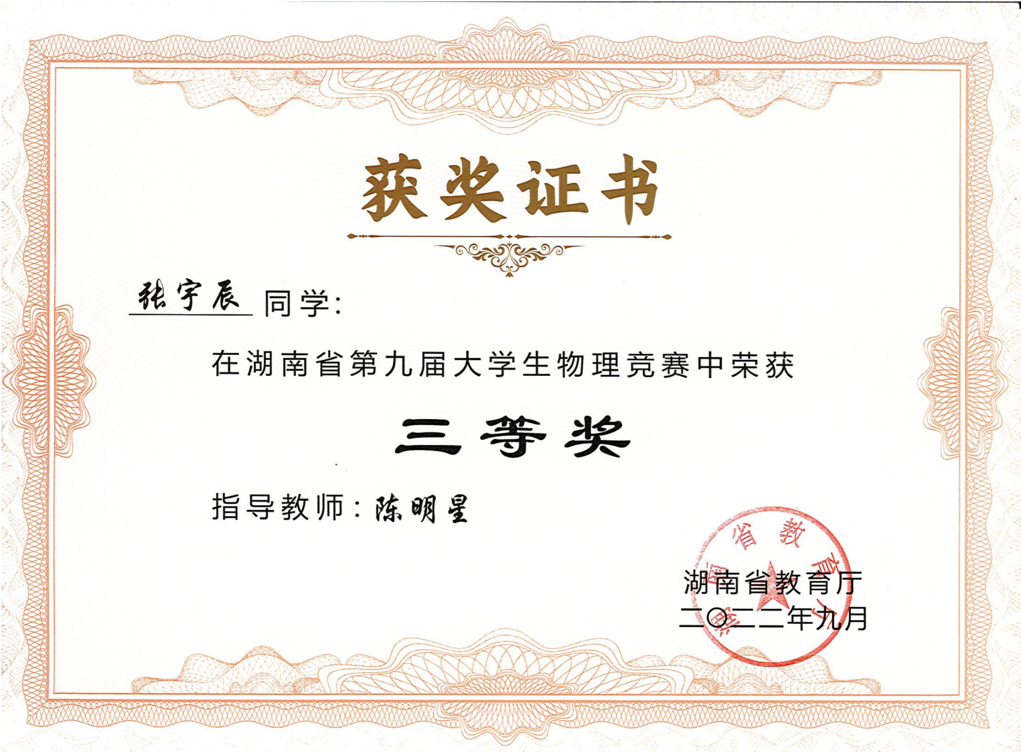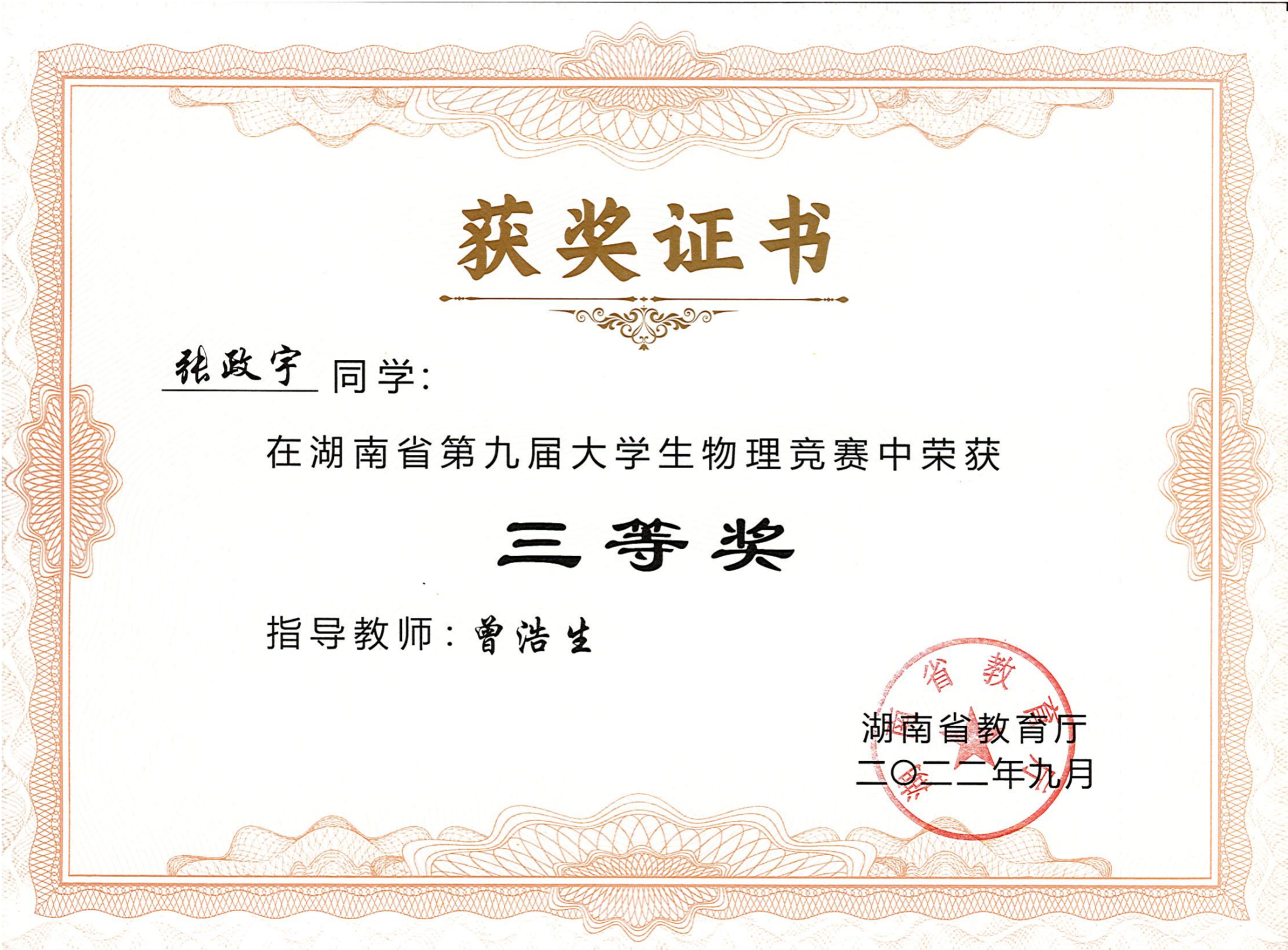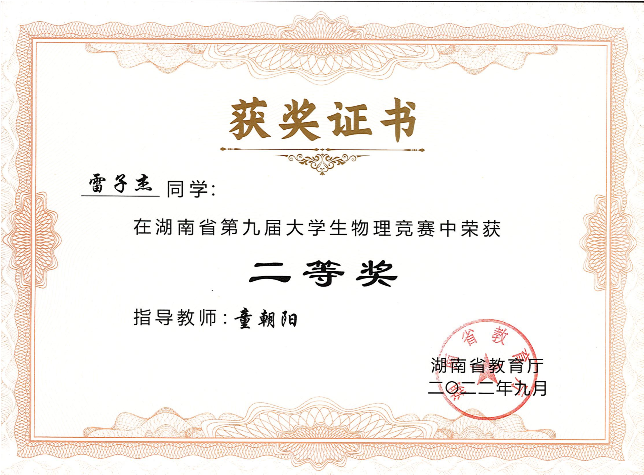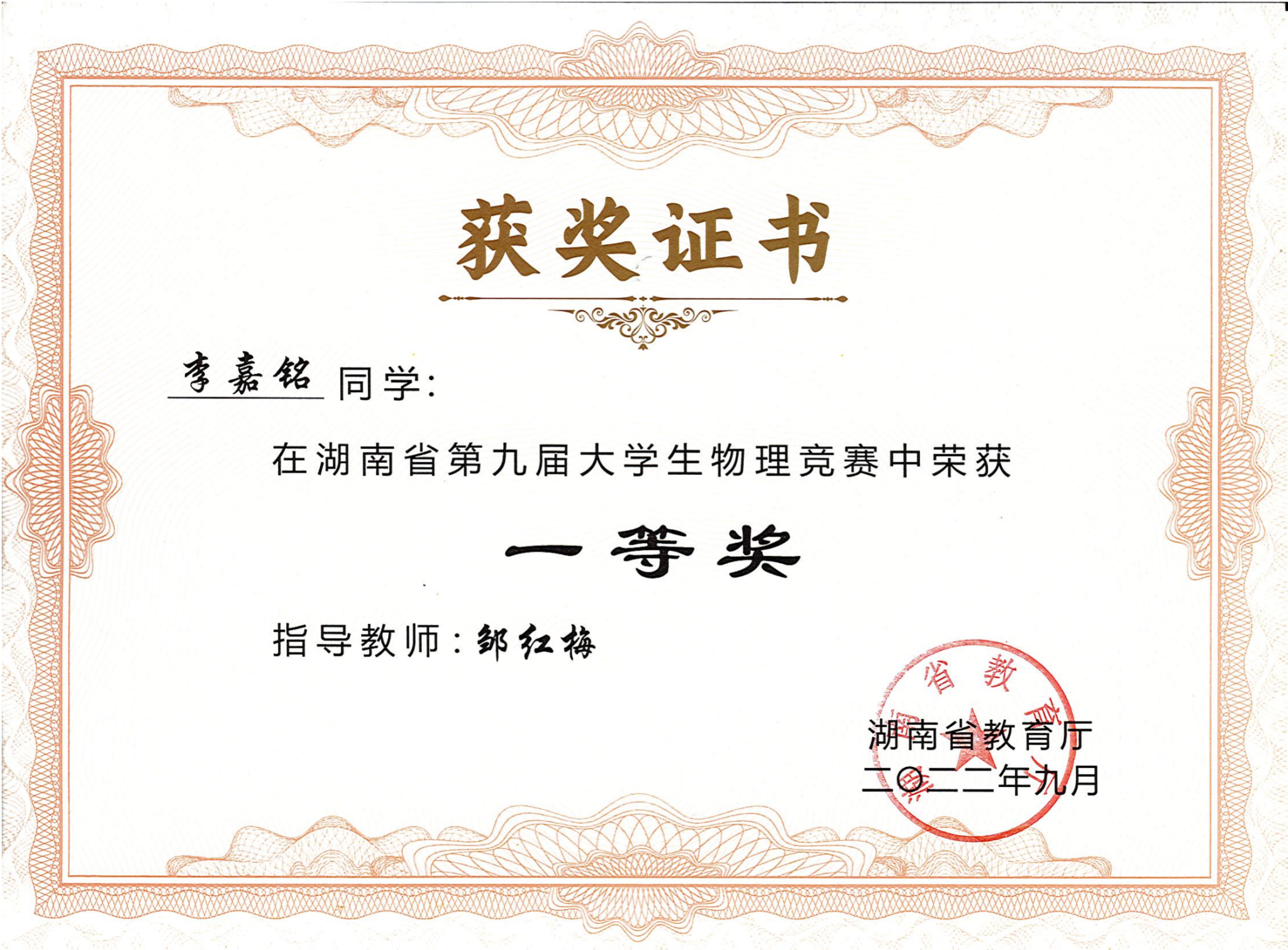 2022年湖南省第九届大学生物理竞赛获奖
