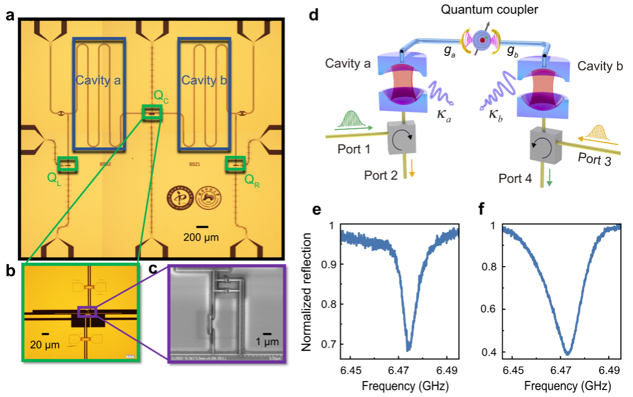 图1.(a)包含两个超导传输线振子和三个超导量子比特的超导量子芯片光学显微镜照片;(b)和(c)分别为超导磁通型量子比特光学显微镜和电镜照片;(d)等效示意图;(e)和(f)分别为两个超导传输线振子随频率变化的透射系数曲线。