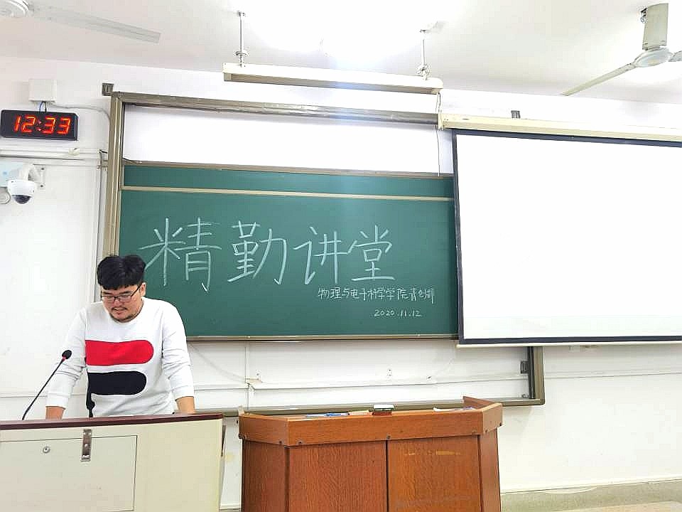 11月12日中午,304am永利集团官网青年创新创业指导中心在格物楼220教室举办主题为“石墨烯的诗与远方”的精勤讲堂。2019级电子班吉程鹏担任主讲人。2019级、2020级部分同学参加了此次讲堂。