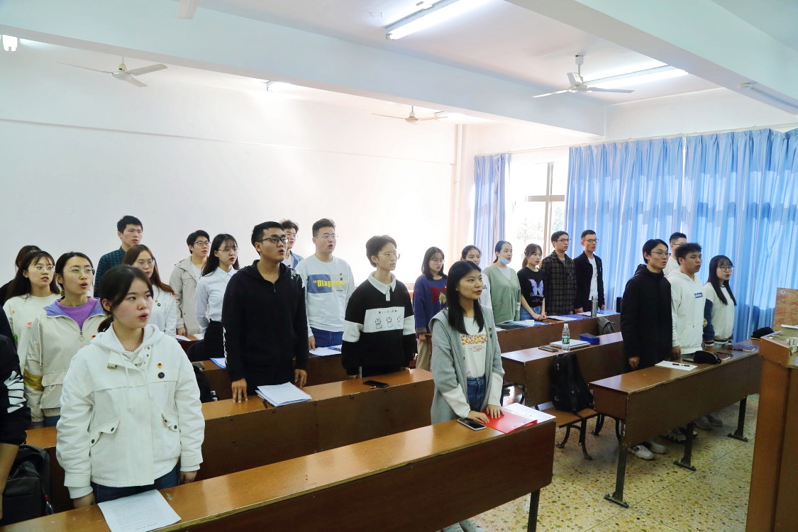 会议伊始,班长简宸简要介绍了与会的代表和会议的流程。全员起立合唱国歌和国际歌。随后,学生代表依次上台发言。林威等学生代表做了对于党课学习、专题学习讨论的汇报,陈民礼等两位学生代表分享了实践活动心得。他们表明要感悟历史、继承传统、激发斗志与肩负使命,并希望能早日通过党组织的考验,成为一名光荣的共产党员。