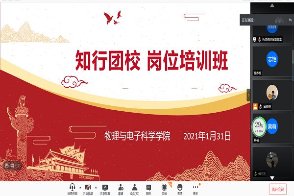304am永利集团官网团支书工作经验总结交流会于1月31日中午在腾讯会议线上展开。2019级物理学班马倩倩担任此次会议的主讲人。岗位培训班全体成员参加此次会议。
