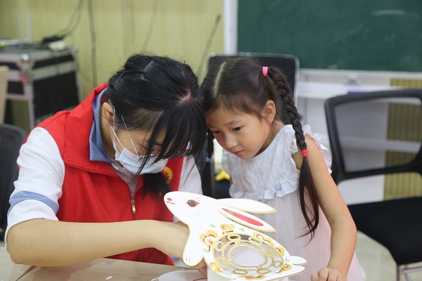 答题过后,志愿者们引导小朋友们制作中秋花灯和拼接爱国钥匙扣,并帮助他们完成加热、扣环的部分。志愿者们还向他们发放一个石膏娃娃、刷子、颜料,协助其完成涂色任务。志愿者们积极与他们互动,参与活动的小朋友们热情高涨,很好地调动了现场气氛。