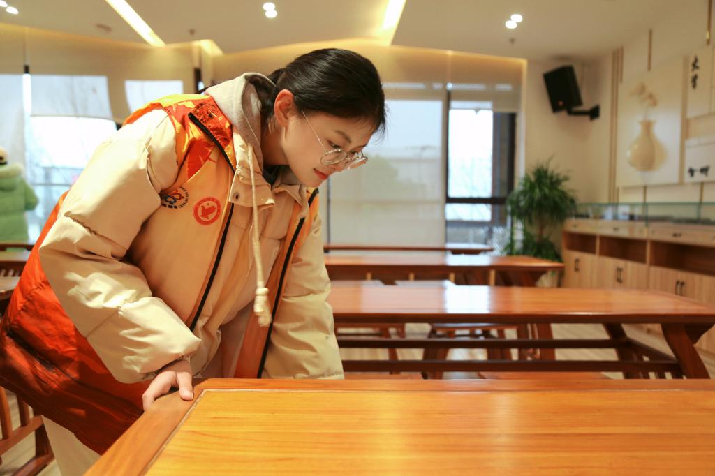 志愿者整理桌椅