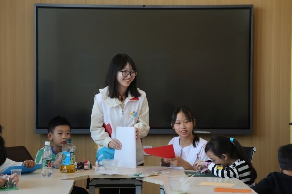 团委区校共建项目部唐一鸣同学担任负责人,带领志愿者们到达图书馆,组织志愿者们进行相关实验器材的准备,有序安排小朋友们入座。