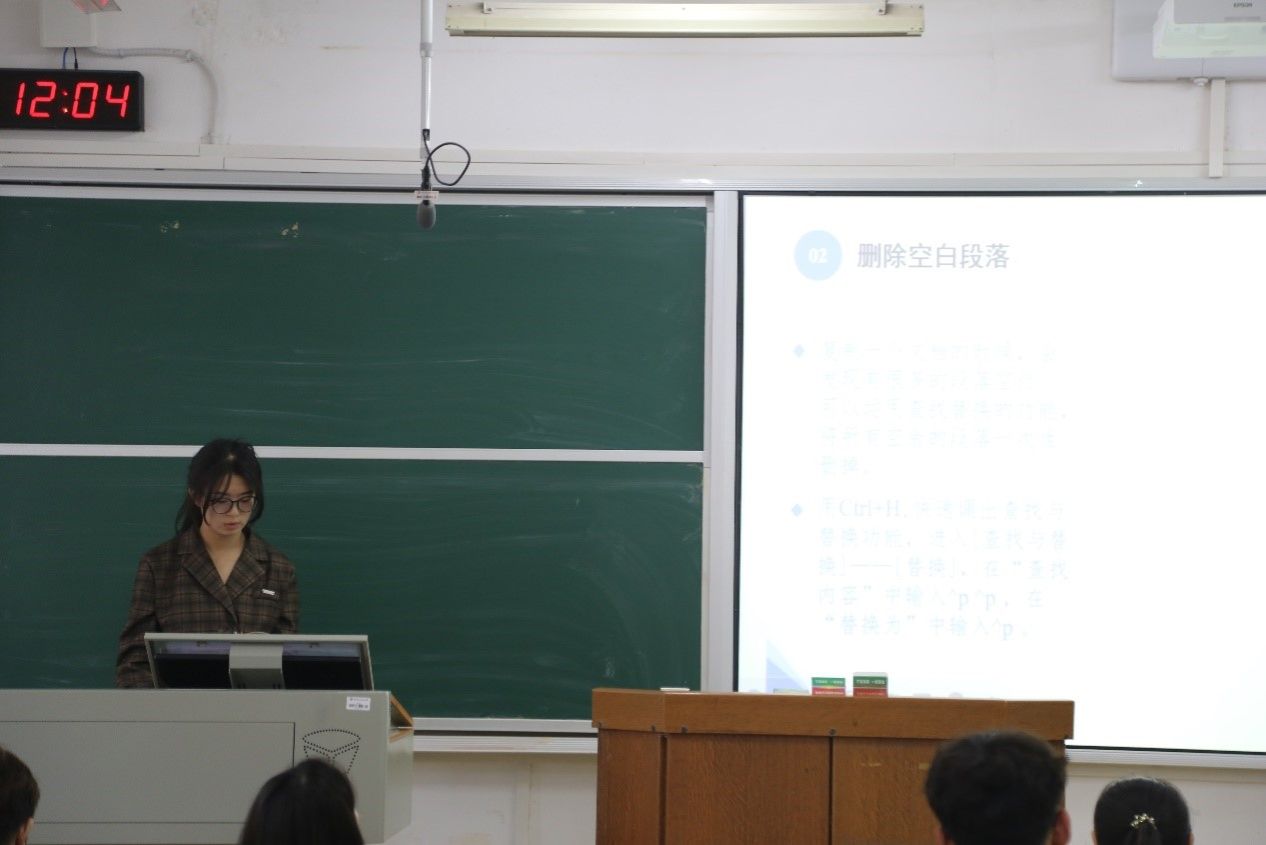 马嘉琦以“如何使用office等办公软件”为出发点,播放并讲解相关视频,具体介绍了常用的办公技巧。她结合多种使用技巧,为成员们演示了在编辑文档时应如何通过特定按键组合完成Word指令、设置分页符等内容。她结合自身工作经验,为成员们解答了应如何处理复制文档时常遇到的问题,帮助成员们更好地进行办公工作。