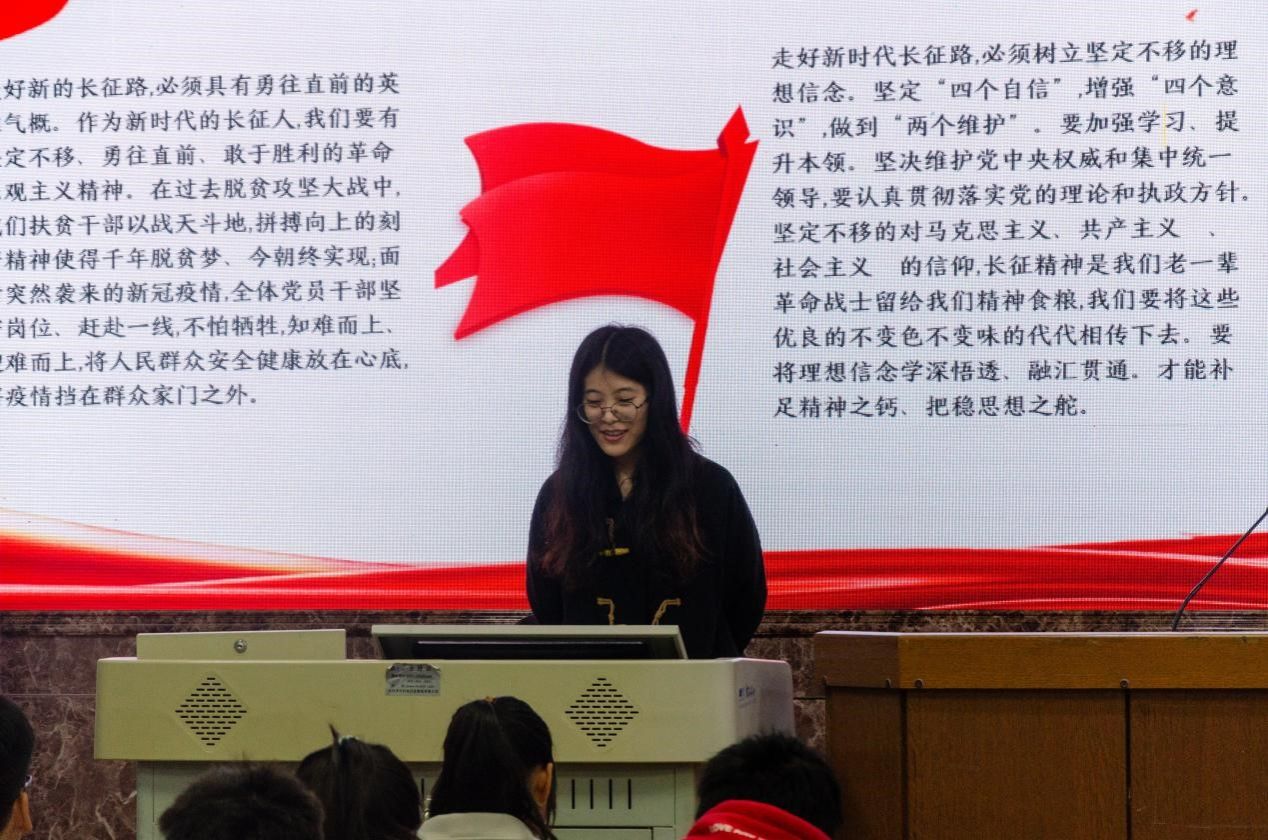 陈凤引用《七律·长征》,带领同学们回顾长征历史背景,并体会伟大革命先烈们奋力完成二万五千里长征所体现的强大意志力。叙述长征历程时,陈凤结合史实解读了长征在中国革命史上的重大意义及长征精神,长征精神凝聚了坚定革命的理想和信念,坚信正义事业必然胜利的革命精神;彰显了不怕任何艰难险阻,不惜付出一切牺牲的大无畏精神;展示了苦中作乐、以苦为乐的革命乐观主义精神。她认为,当代大学生身为新时代青年,应当在日常学习生活中发扬伟大的长征精神,树立坚定的理想信念,努力学习科学知识,提升本领,立足大局,心怀“国之大者”的理念,将长征精神一代一代传承并发扬光大,走好新时代的长征路。