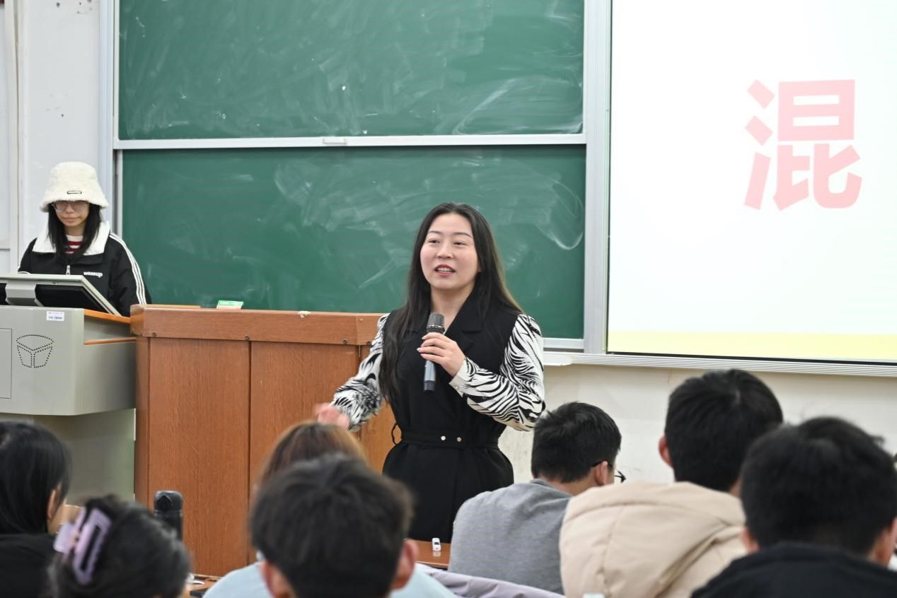 李婉云用不同的语言进行自我介绍、与现场同学打招呼,她通过播放日韩歌曲、介绍外语影片来调动同学们对学习第二外语的兴趣。对于语言学习途径问题,李婉云向同学们分享自己的小语种学习经历与所得成就,并为同学们展示了洋光的优秀学习案例,增长了同学们的学习热情。学习外语是一个需要坚持和努力的过程,需要耐心和毅力,她激励同学们不要虚度光阴,并建议同学们平日注重拓展词汇量并加以积累,敢于并积极使用所学语言,表达了对同学们积极学习第二外语的期望。