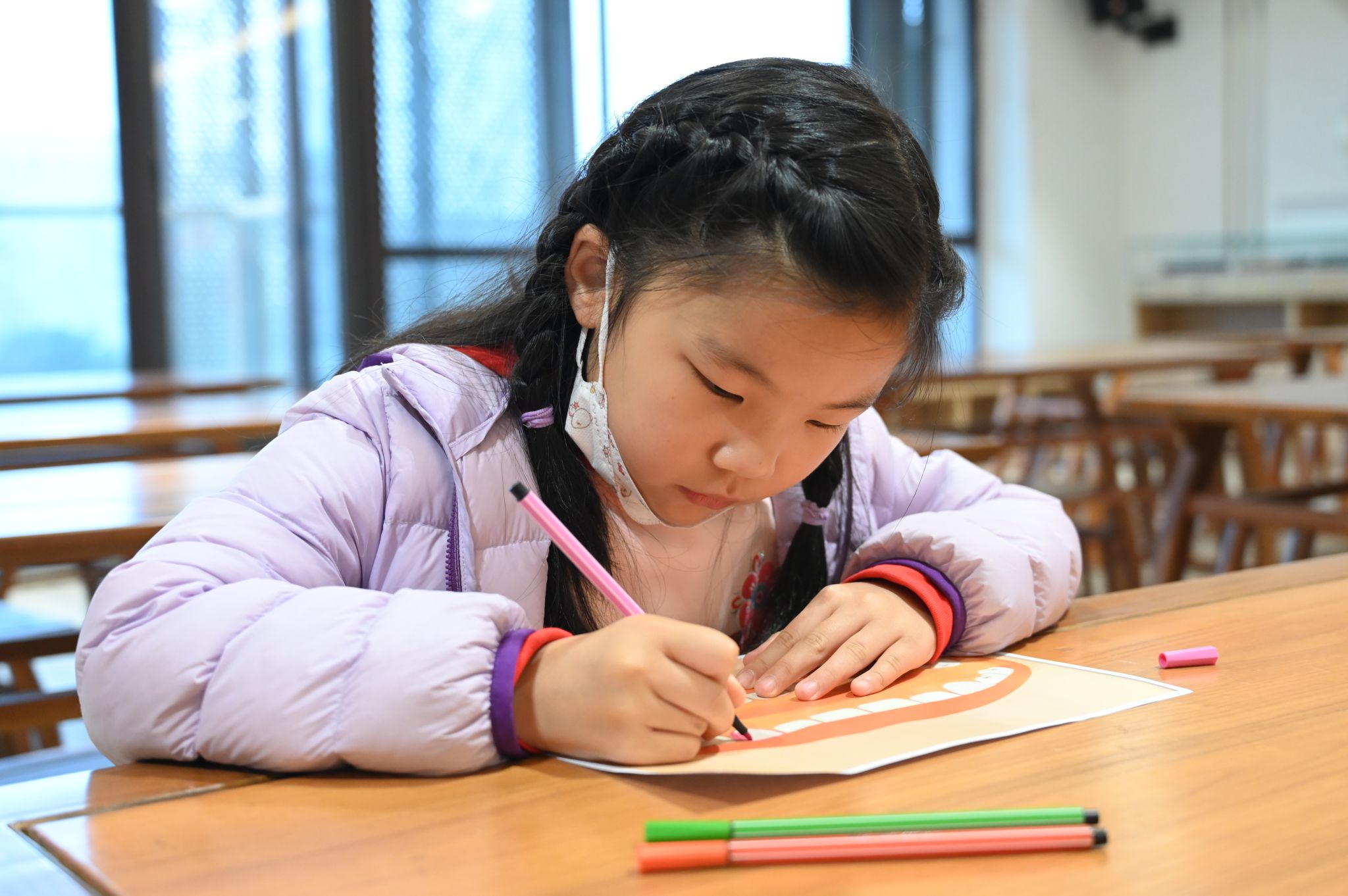 主讲人结合生动有趣的绘本故事,从洗手七步法、保护牙齿健康和爱护公共卫生三个方面向小朋友们展开讲解。小朋友们跟随主讲人引人入胜的讲述进入绘本故事,学习健康的生活方式、了解保护牙齿和爱护公共卫生的重要性。主讲人通过问答的方式与小朋友们进行互动,加强小朋友们对七步洗手法的记忆,提高语言表达能力。此外,志愿者们还为小朋友们分发了画笔和彩纸,让小朋友们通过绘画的方式认识不同种类的牙齿,提高动手能力。