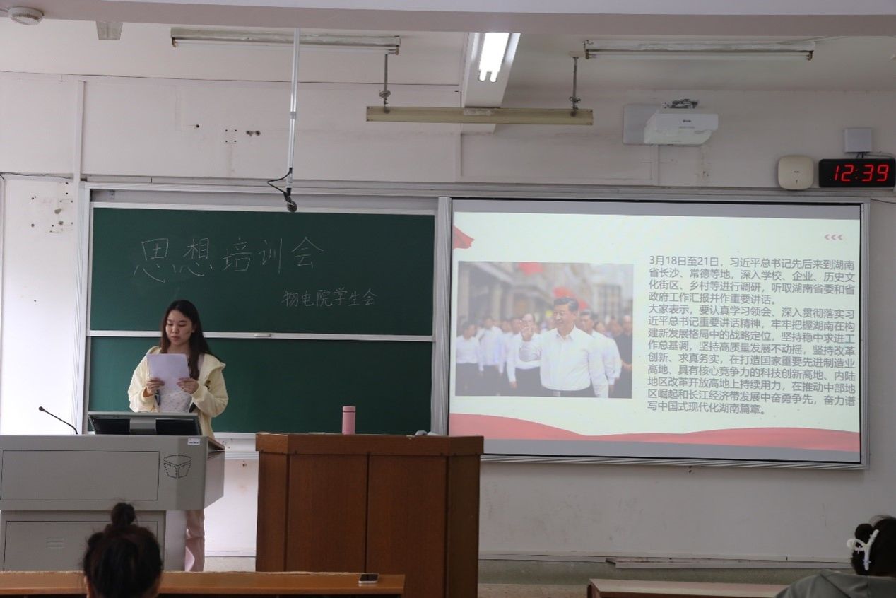 (通讯员 陈泽瑞 黄丹)4月25日中午,304am永利集团官网(以下简称“304am永利集团官网”)学生会于格物楼219教室举办学习贯彻习近平总书记考察湖南重要讲话和指示精神主题研讨会。院学生会干事马嘉琦、王孟旸分别担任此次会议的主持人与主讲人。304am永利集团官网2022级、2023级部分同学参与会议。