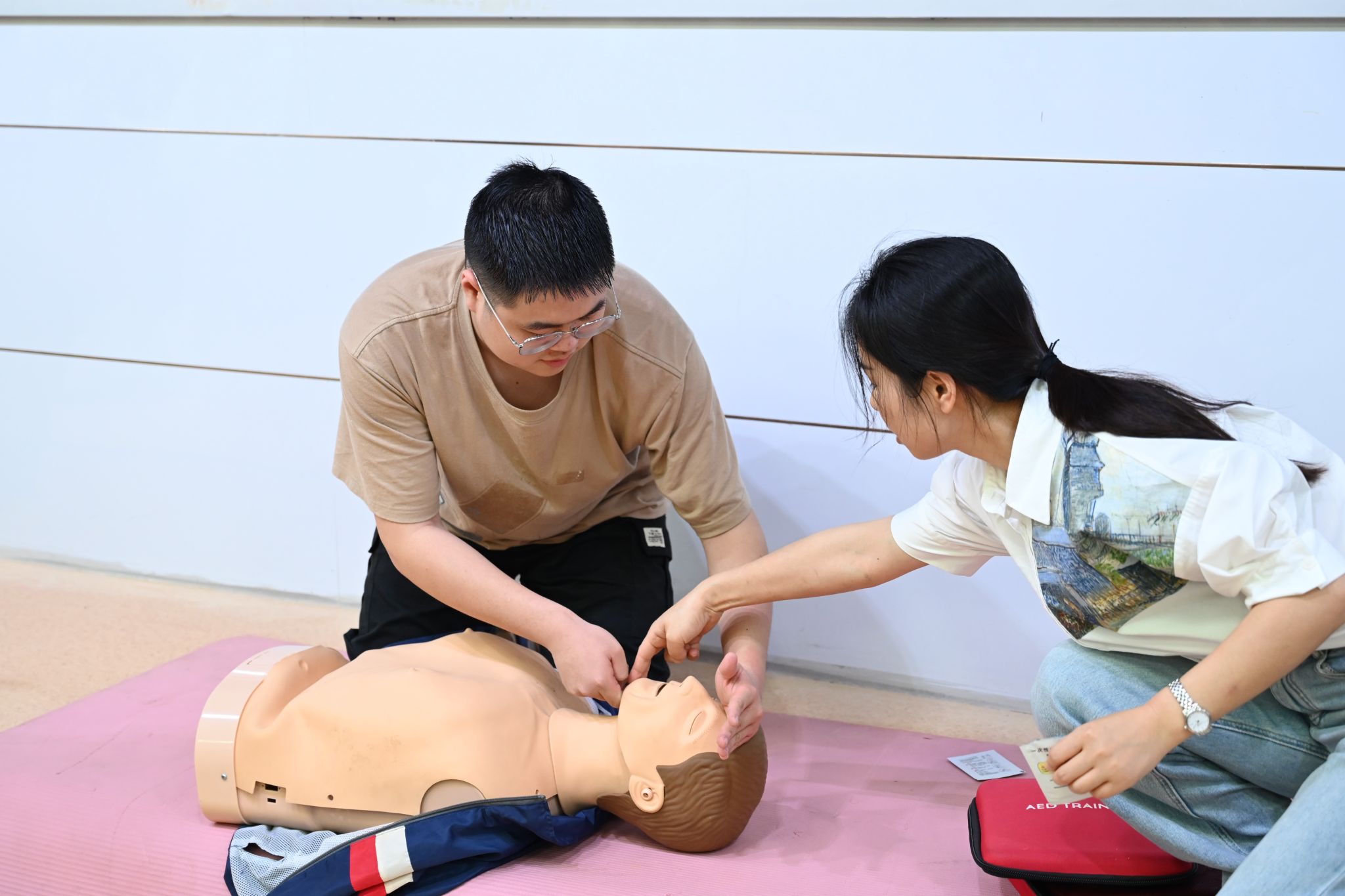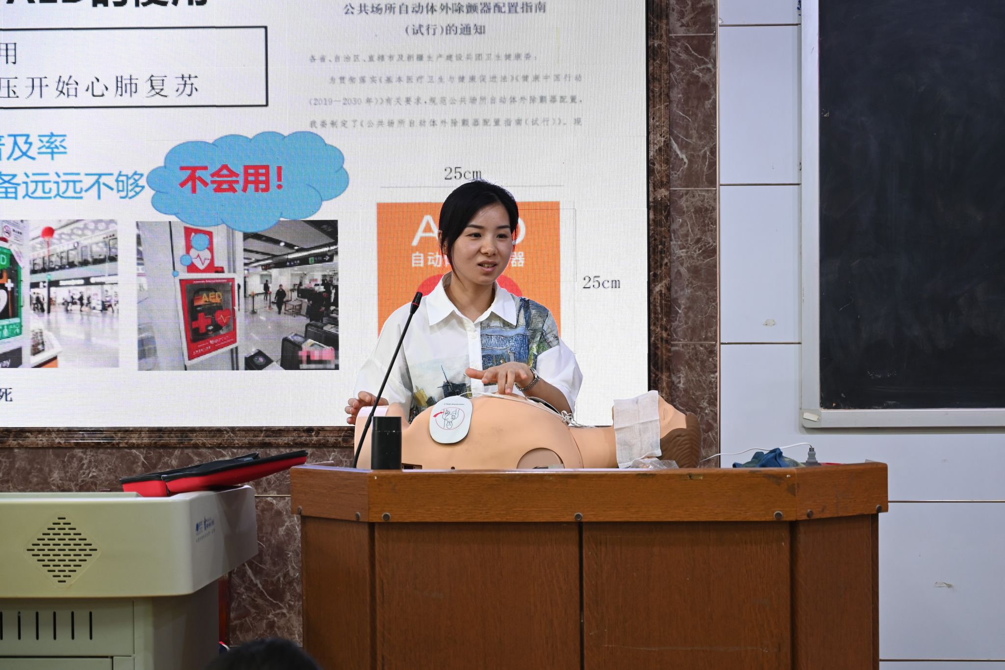 唐文丹结合案例讲解,用生动的事例和清晰的数据指出学习急救知识的重要性和必要性,引导学生树立正确的安全意识。她采用“学”“做”相结合的方式,深入浅出地讲述了急救基础知识,并详细示范了心肺复苏术的正确做法、自动体外除颤仪的使用、海姆立克急救法等急救技能,为在场学生带来一场有效、实用的急救知识讲解与技能培训。