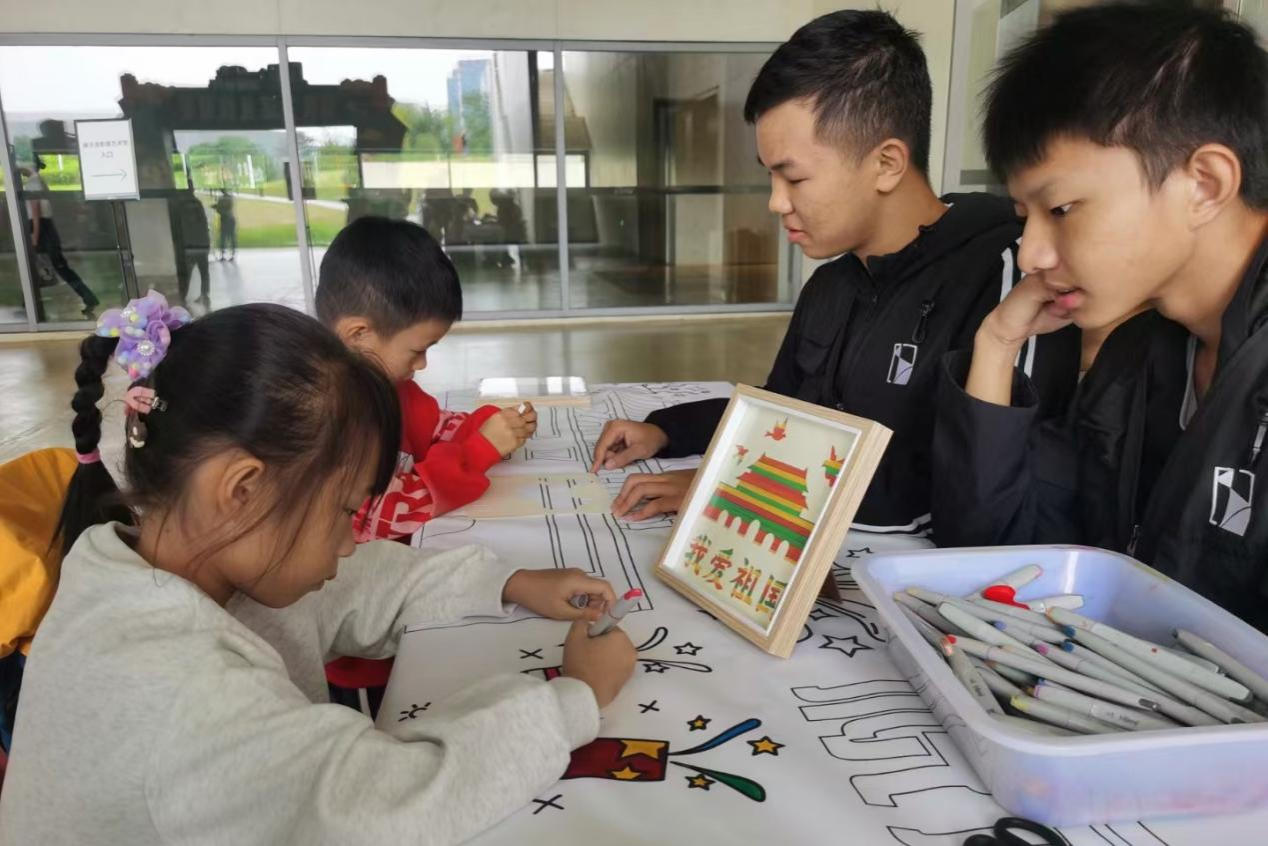 志愿者们提前到达活动地点并协助谢馆工作者布置场地,活动现场,志愿者们身穿统一的谢馆志愿者服装,协助活动现场的工作人员,为参与活动的游客提供各种服务,包括接待引导、国庆涂鸦、DIY图画编织、国庆打卡等。游客们充分发挥自己的想象力,在画布上涂鸦着自己喜欢的颜色,并且发挥着自己的动手能力,编织了一个个属于自己的图案,并进行合影留念。