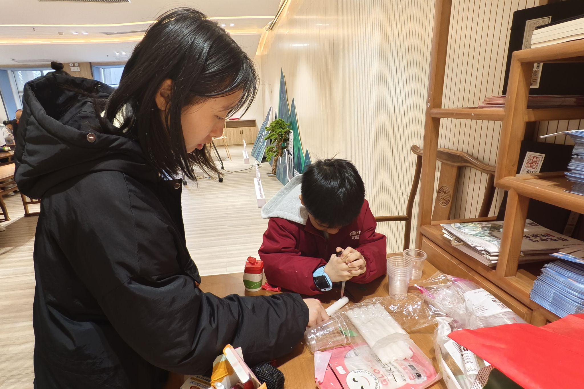 实验开始前,符佳慧运用生动形象的图文资料,讲解了“空气炮”与“会吸水的杯子”两个趣味实验的原理,引导小朋友们思考完成实验。原理讲解完毕后,志愿者们分发实验道具,组织小朋友们有序就坐,演示实验过后,志愿者们耐心指导家长与孩子们一起动手完成实验。实验过程中,志愿者们细心解答小朋友们的疑问,鼓励他们动手操作、积极思考,带领他们深刻感受物理知识的魅力。