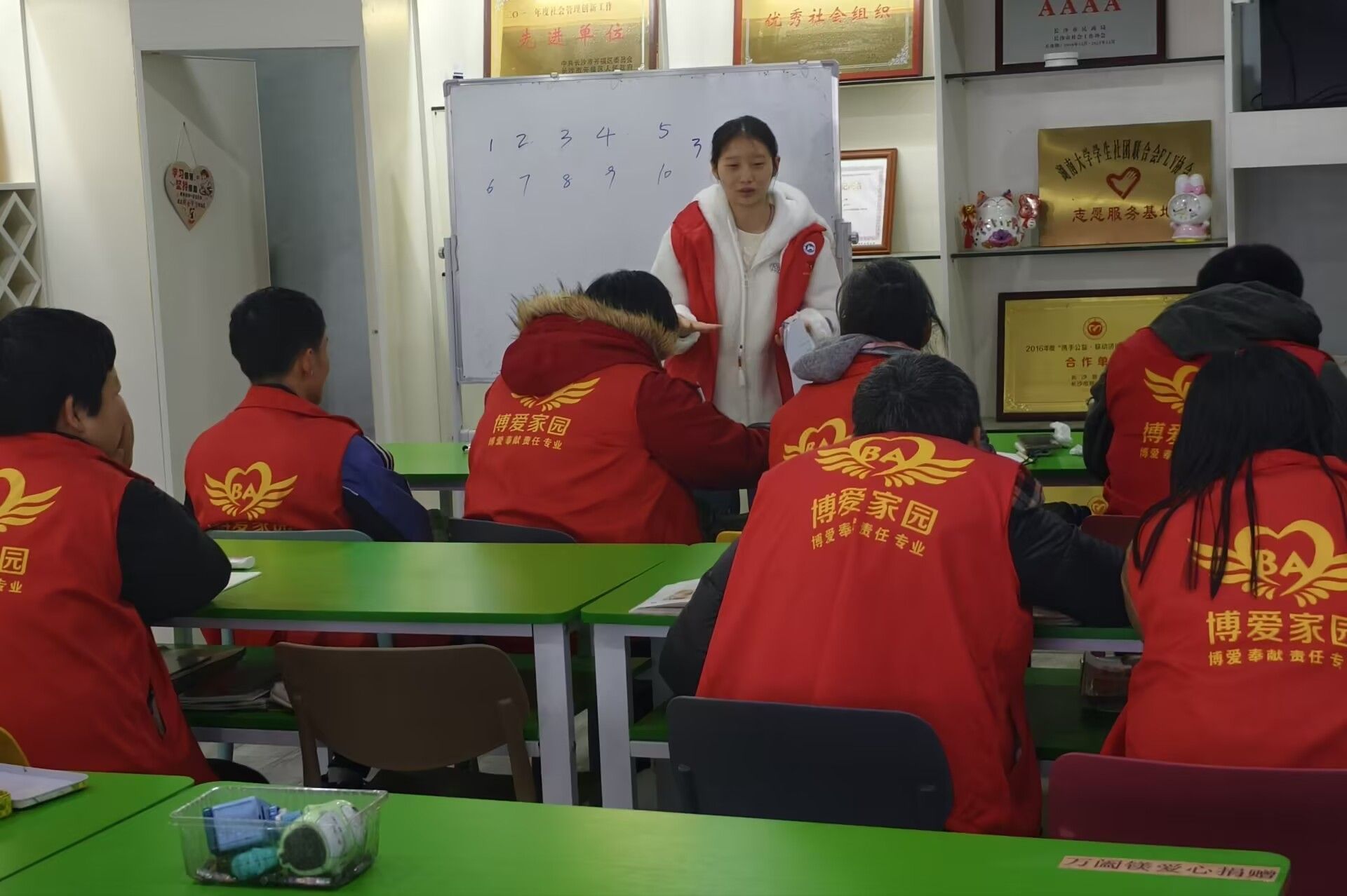 活动当天,龙瑞向志愿者们介绍心智障碍人士的基本情况,并派发任务。数字课上,志愿者们借助数字卡片,帮助心智障碍人群直观认识数字,激发他们的学习兴趣。汉字课上,志愿者们引导心智障碍人士练习一笔一划地规范书写,提升他们的语言认知和书写能力。折纸课上,志愿者们向心智障碍人士讲解并示范简单折纸步骤,对他们进行一对一指导,使他们的手眼协调能力得到锻炼,增强他们的自信心和成就感。完成所有课程教学后,志愿者们协助博爱阳光家园的工作人员带领心智障碍人士完成“博爱阳光家园幸福指数“表格填写。
