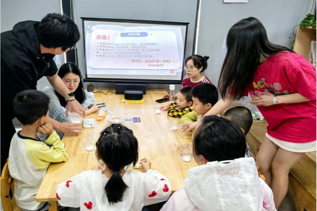 课程开始前,志愿者们协助工作人员安置投影设备、准备实验材料,并组织小朋友有序入座。课堂上,主讲人为小朋友们讲解绘本《烟花》,并结合问答的方式为小朋友详细介绍烟花的由来和形成图案的原理,课堂井然有序、气氛生动活跃。主讲人还为小朋友介绍了“大象牙膏”的实验原理,并用演示视频展示了实验过程和结果。实验环节正式开始后,志愿者们协助小朋友完成“大象牙膏”实验和黏土螃蟹的手工制作,小朋友们在实验过程中亲身感受探索科学的乐趣。