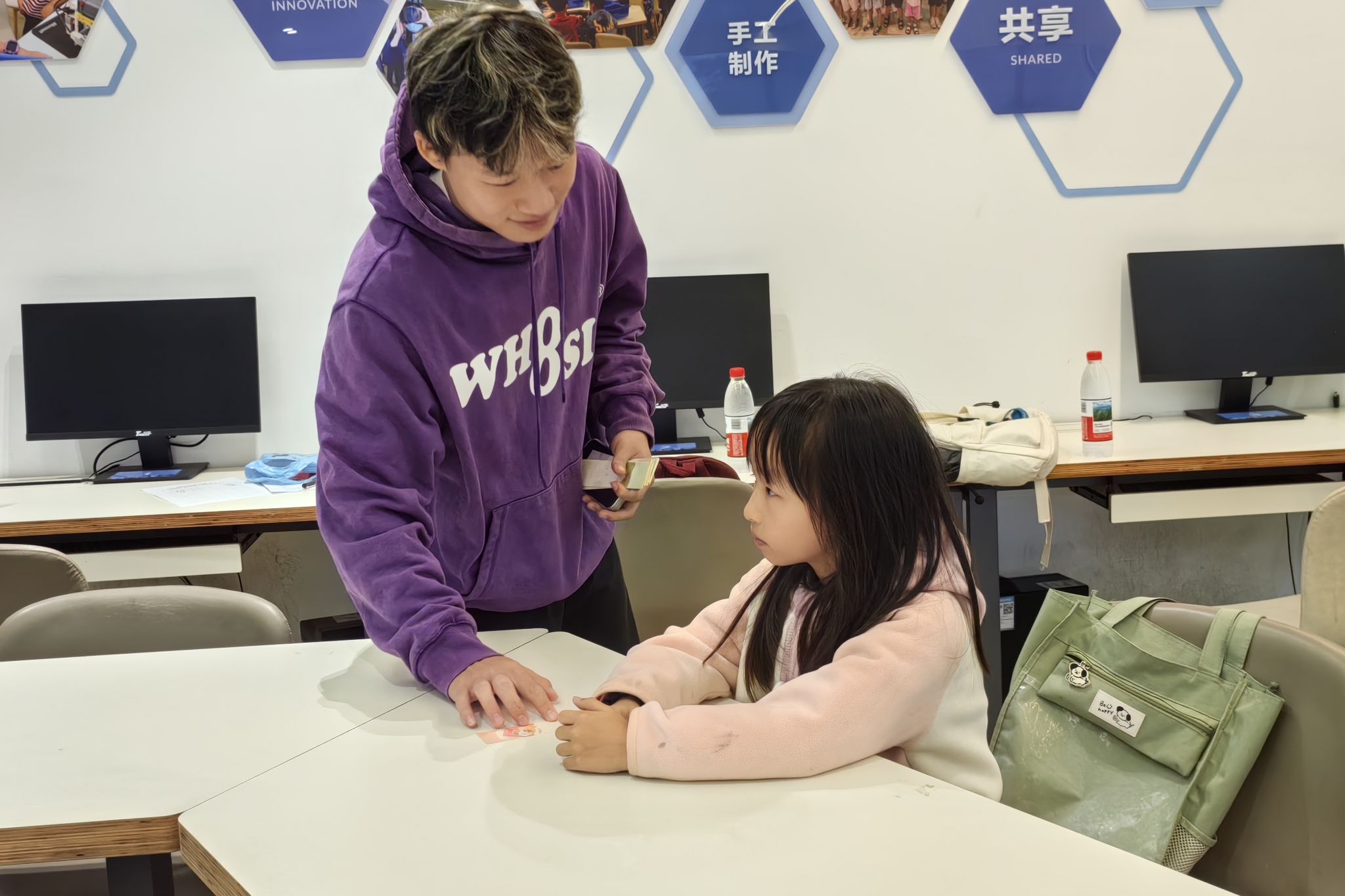 志愿者奖励积极发言的小朋友