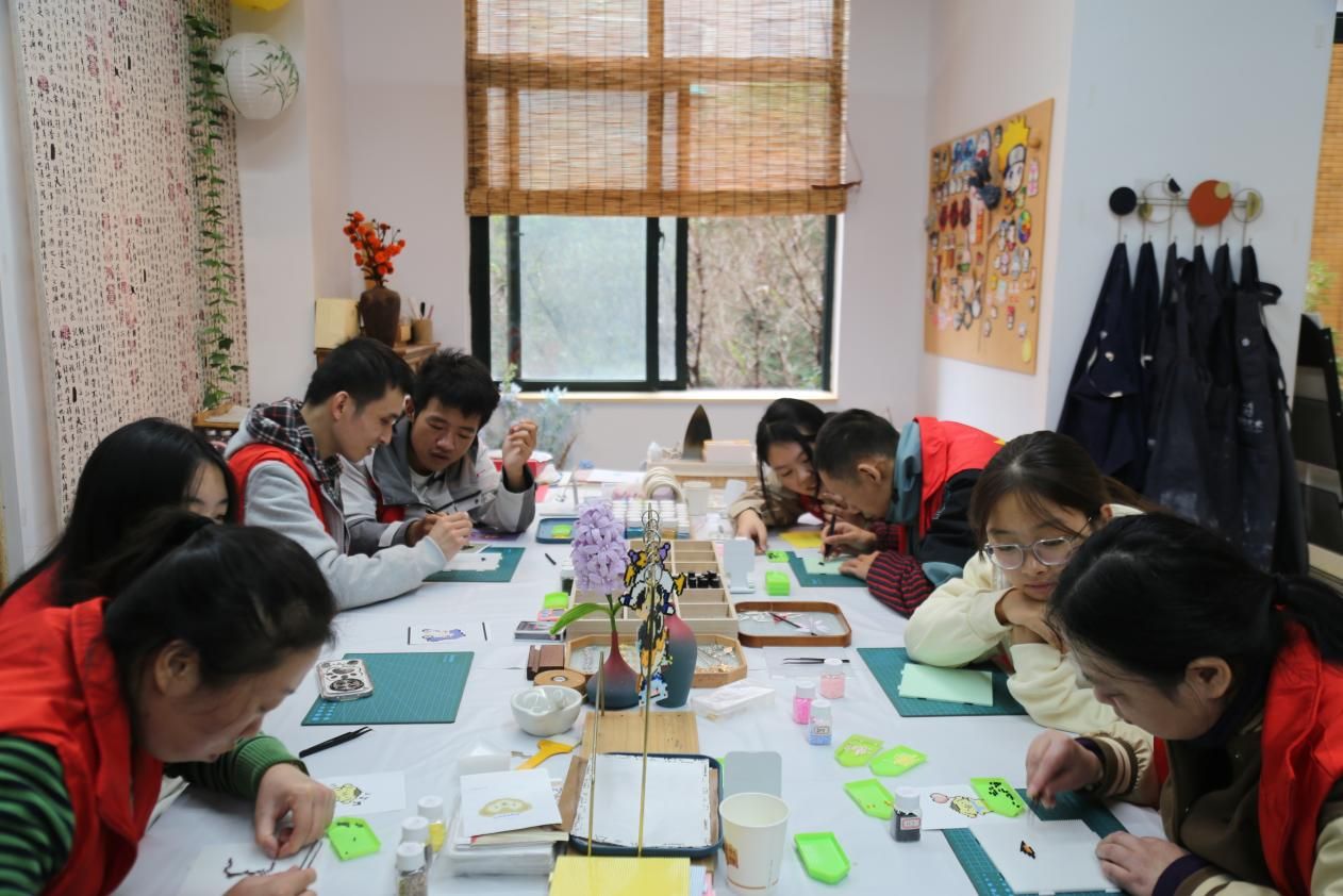 活动当日,刘晓向志愿者团队介绍心智障碍人士基本情况并部署具体任务。团队乘车抵达长沙市芙蓉区蒲公英社会工作服务中心后,志愿者引导心智障碍人士参观文创工作室作品展陈,通过耐心交流帮助其感受艺术创作的价值内涵。随后,志愿者与心智障碍人士共同开展明信片组装及拼豆文创手工制作活动,实施全程一对一陪伴指导,通过实操演示讲解操作规范与安全要点,鼓励完成创作任务。在良性互动过程中,活动有效提升了心智障碍人士的动手协调能力与注意力持续水平,同时促进其建立创作成就感与自我认同意识。活动终末,志愿者协助中心工作人员完成物料整理工作,并与心智障碍人士及中心代表共同合影存档。
