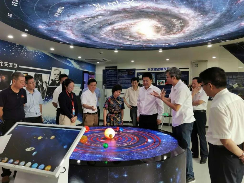 唐东升院长先后向傅书记介绍了恒星的形成,太阳系八大行星,星座和宇宙简史等天文知识。傅书记兴致满满,在介绍恒星的形成时,询问了目前太阳的年纪和所处时期;在介绍八大行星时,提问了目前中国开展的天问一号项目,勉励大家关注国家发展和时事;在介绍星座时,提出“到底是先有长沙还是长沙星?”,趣味十足,引人深思;在了解宇宙的历史时,不禁感叹了人类的渺小和宇宙的浩瀚。最后,通过天文馆的大型天文科普望远镜饶有兴致地观测了太阳。