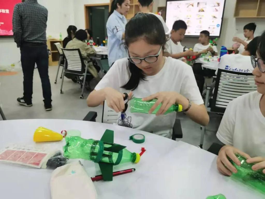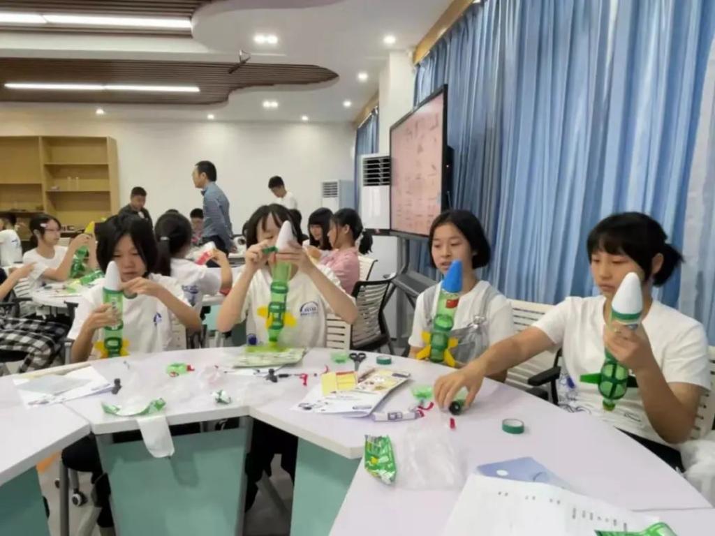 曾老师以宇宙有多大为引入,把大家带到探索太空的世界里。从目前的太空旅行离不开火箭出发,谈到了火箭的发展史,并简单介绍了火箭的基本原理。随后,同学们在老师的带领下,完成了水火箭的制作。