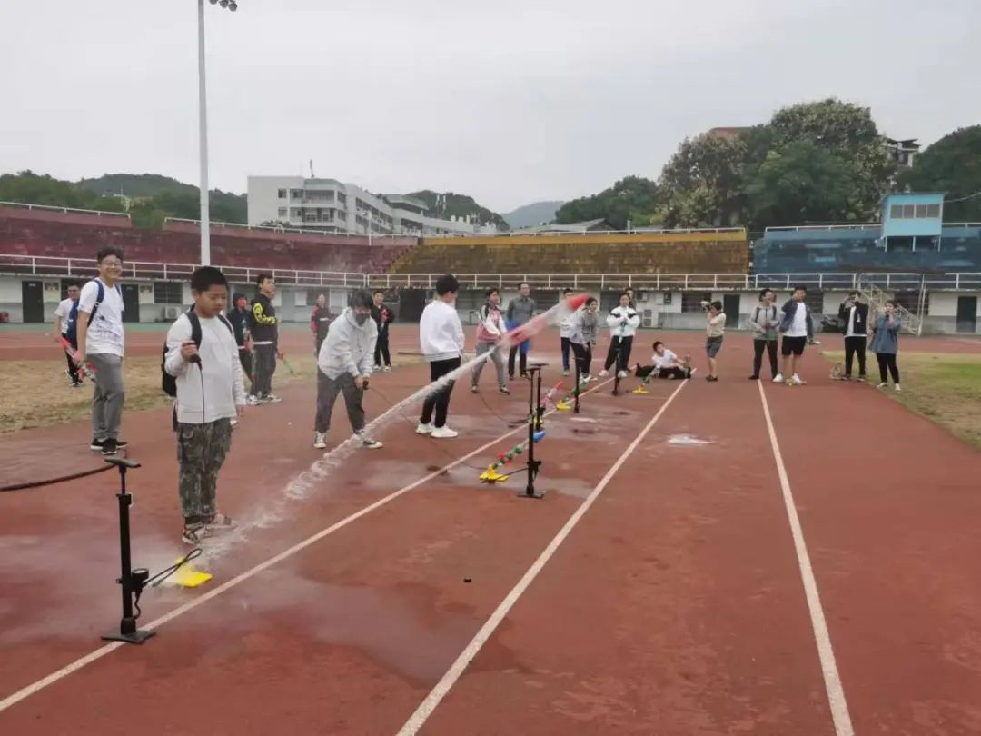 当然,制作了水火箭,那肯定是要试一试它的威力到底有多足。于是,老师们又把学生带到了田径场,来了一场好评不断的水火箭比赛。