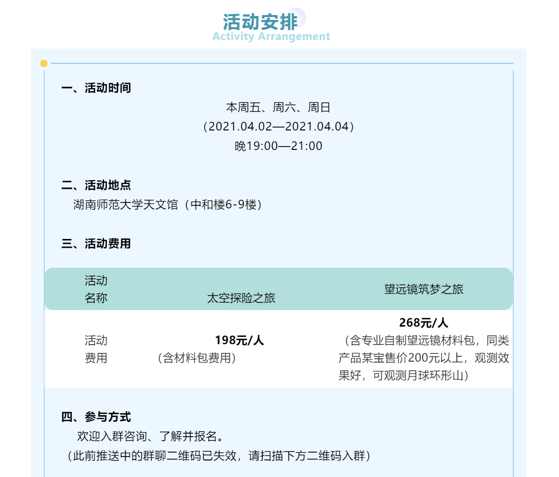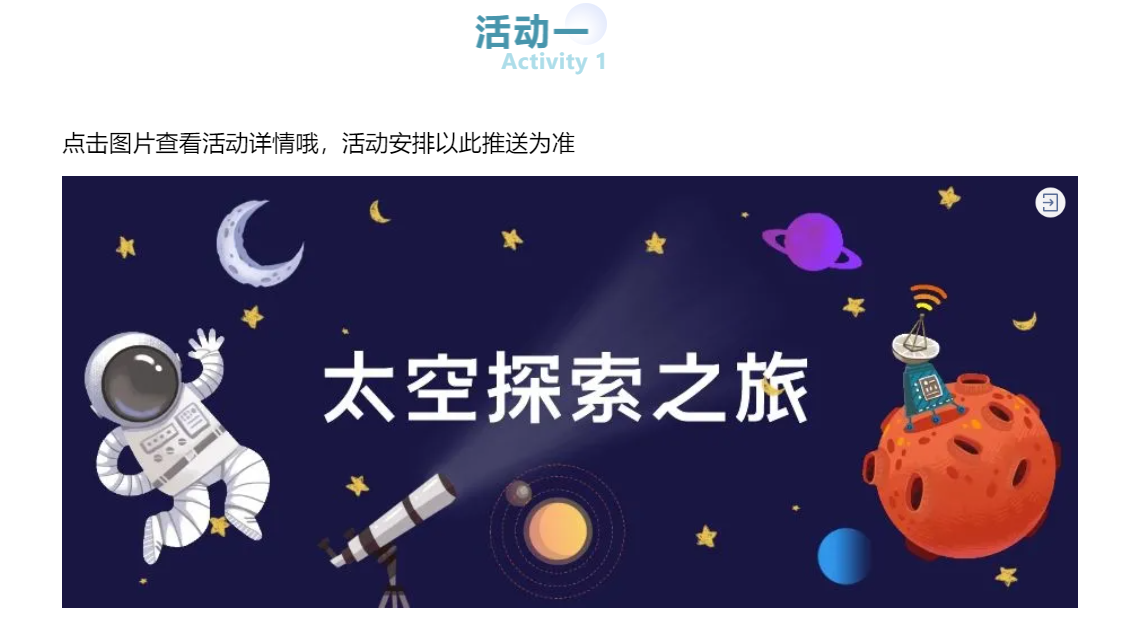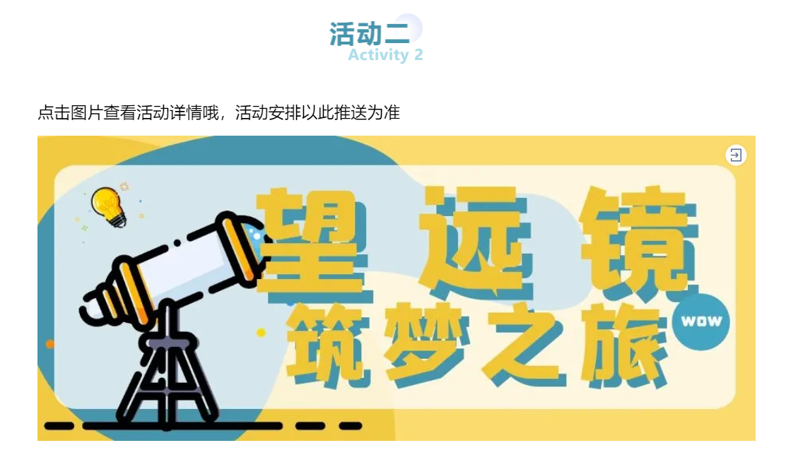 也有不少家长们反馈,自家小朋友没来得及参与前期课程,希望加开几场!经商议决定,为感谢大家对天文趣味科普课程的持续关注和喜爱,本周末将继续开设《望远镜的前世今生》和《太空探索之旅》两个课程。这个小长假,一起相约来天文馆追“星”吧~