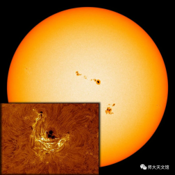 在众人眼里,太阳表面看似非常光滑,但其实仔细一看就会发现太阳表面有许多的'雀斑,这些雀斑是什么呢?它们究竟是干什么的?其实这些雀斑的真实身份其实是太阳黑子,那为什么要叫黑子?是因为它们长得黑吗?其实不然,只是由于这些黑子存在的温度不高,远远看上去仿佛是太阳表面的一层米粒,甚至颜色相对于其他区域比较暗淡,所以被叫做太阳黑子。每个太阳黑子的直径约为几百至几万千米,而一个中等大小的黑子半径大概和地球差不多。世界上第一次明确的黑子记录是公元前28年我国汉朝人所观测到的,不过直到公元1610年,意大利天文学家伽利略首次用望远镜看到了太阳黑子,发现黑子是太阳表面非常普遍的现象。