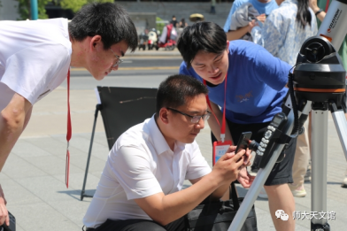 在五舍广场前,天文协会的志愿者们将组装好的天文望远镜对准太阳,进行多次调试,确定在望远镜上可观测到清晰的太阳黑子后,志愿讲解员们开始邀请路人进行观测。精密的仪器与讲解员们的邀请吸引了大批路人驻足观看,志愿讲解员们借此机会向他们讲解与太阳黑子相关的天文知识,并认真回答路人的问题。讲解员们在活动中讲解细微,操作细致到位,得到了路人的称赞与肯定。