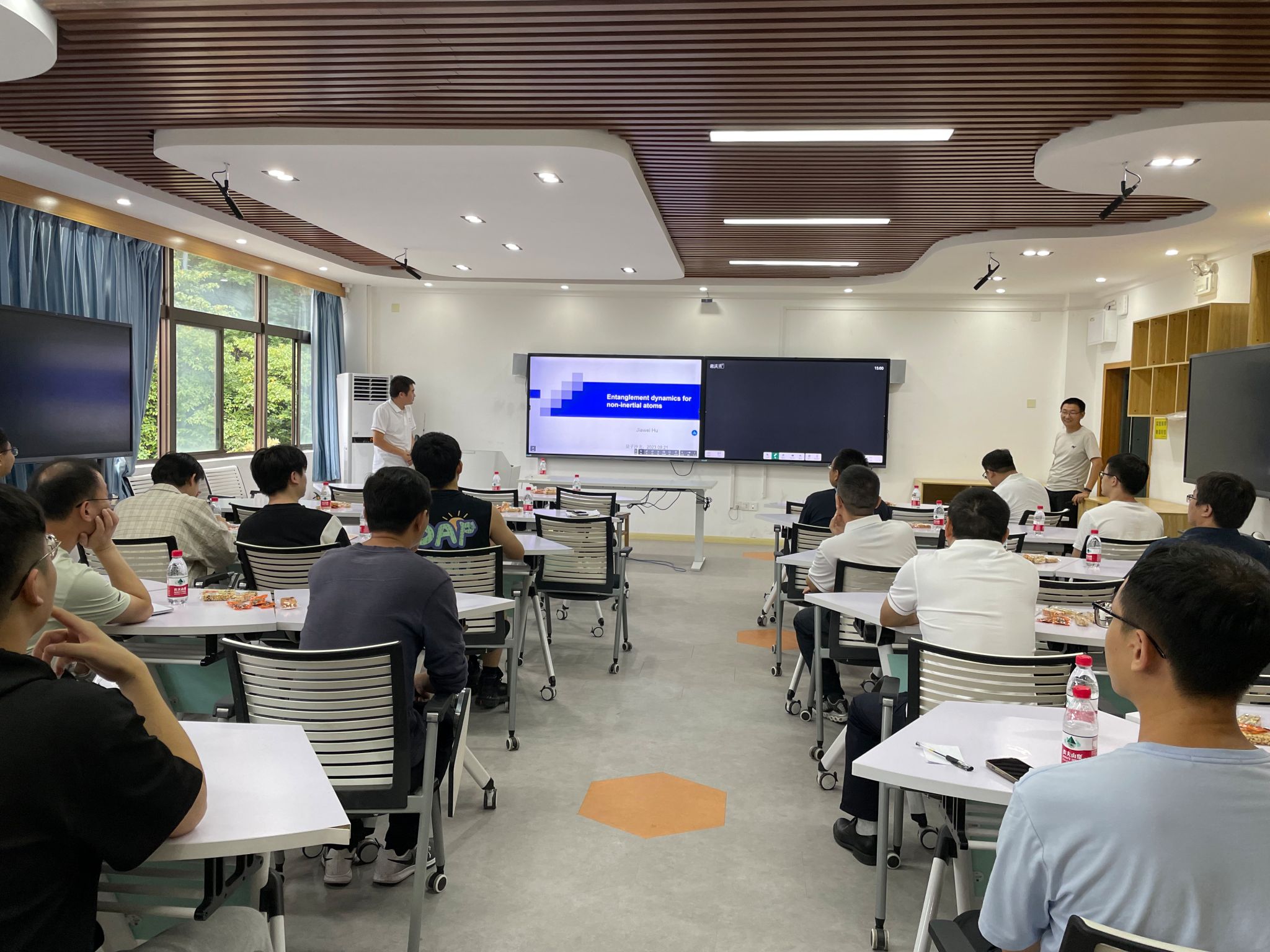 胡老师在报告中围绕“非惯性量子系统的纠缠动力学”这个主题,首先介绍了量子场论中真空的概念与Unruh效应等背景知识,随后具体介绍了非惯性量子系统的纠缠动力学,以及利用非惯性量子系统的纠缠性质探测Unruh效应的方案等近期研究工作。胡老师报告深入浅出,逻辑清楚,在场师生收获颇多。