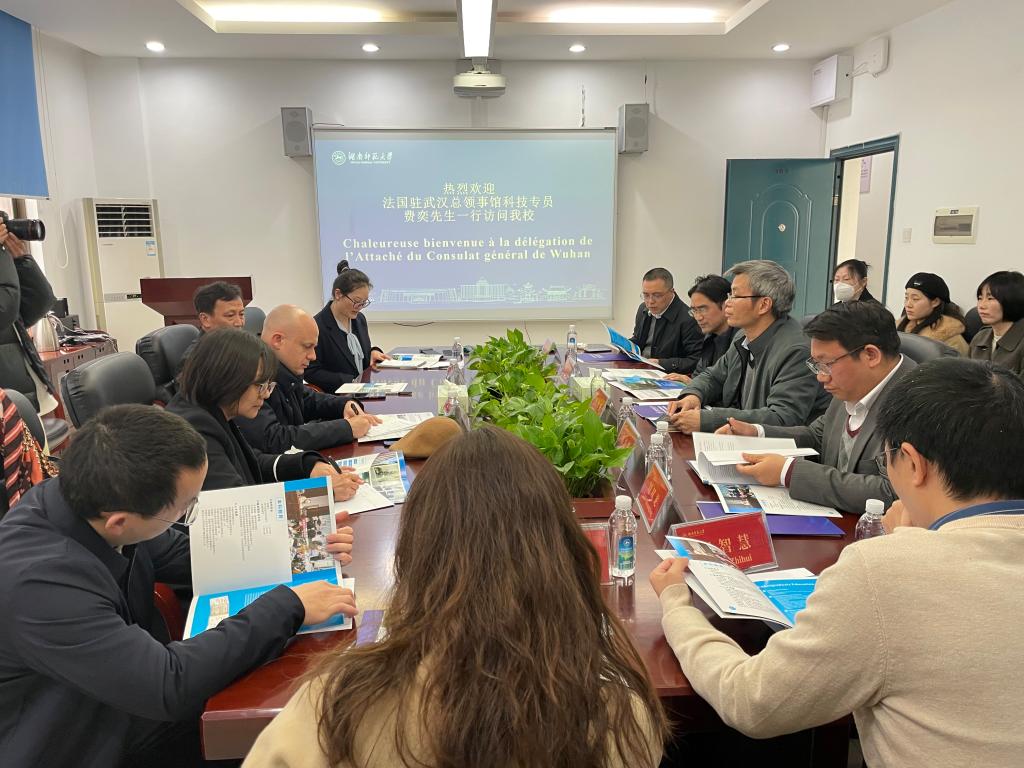 唐东升对法国驻武汉总领事馆代表表示热烈的欢迎,并简要介绍了永利官网办学的整体情况。欧阳钢介绍了永利官网研究生的培养情况,就合作协同育人等事宜进行了热烈讨论。廖洁桥介绍了永利官网学科建设、科学研究情况,表示愿意进一步加强与法国高校和研究机构之间的交流合作。会上教师代表就科研合作事宜进行了深入讨论交流。