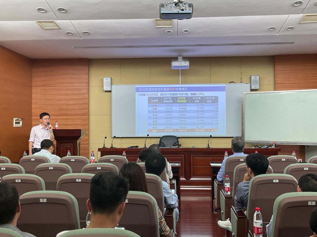 邹永星副处长介绍了2022年度国家自然科学基金的总体情况和我校自然科学基金的申报、立项情况,并对2023年度国家基金申报的重要时间节点做了详细部署,同时他要求老师们在基金申报过程中要重视科研诚信,要做到守住底线,不碰红线,追求高线。