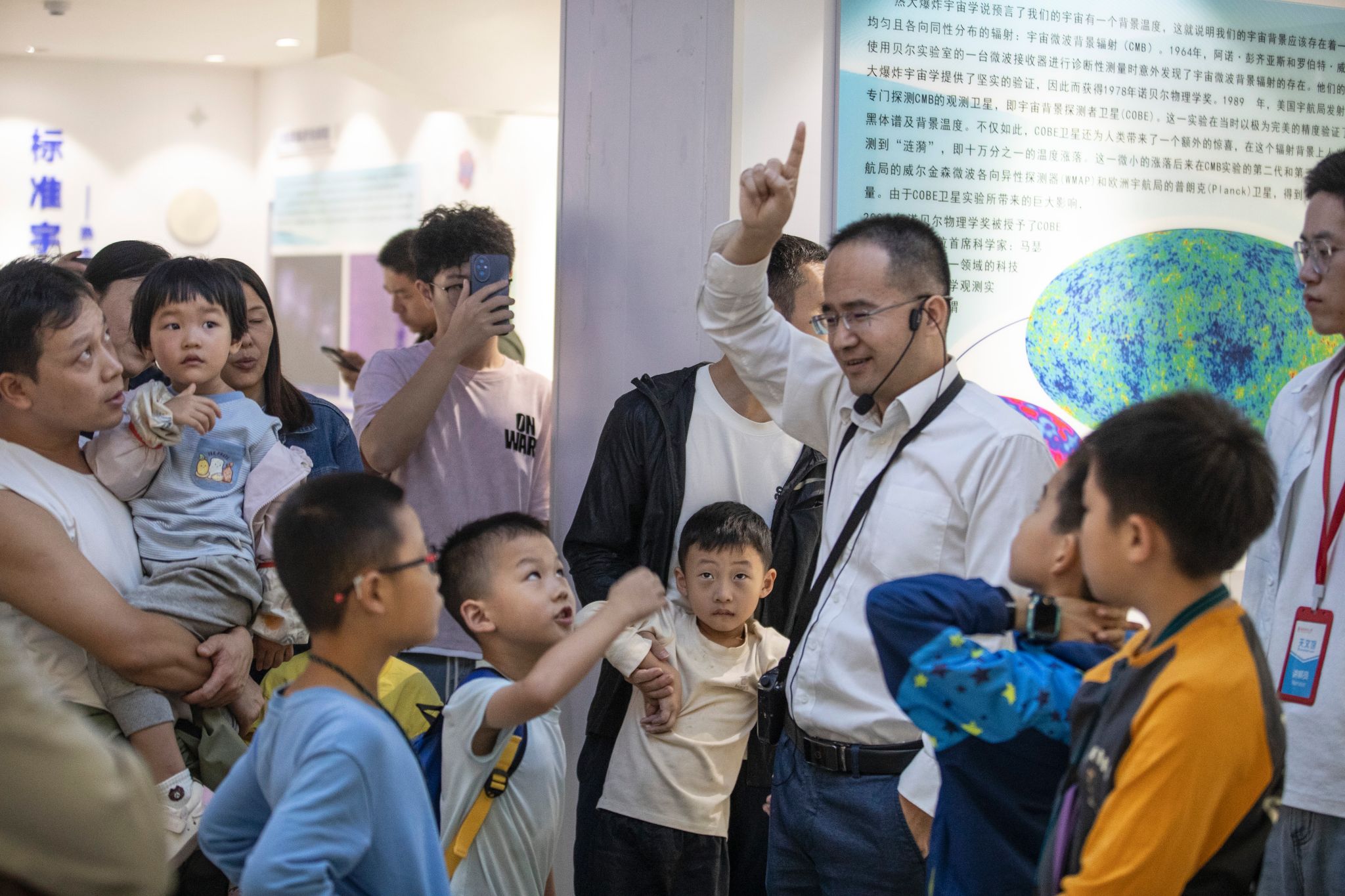 活动中,物理系教工党支部党员、湖南省“杰出青年基金” 获得者、学校天文学学位点负责人袁尊理教授带领参与活动的党员及青年师生化身“星空向导”,带领中小学生参观天文主题展览,组织现场天文观测,通俗讲解天文知识与宇宙奇观,为在场师生和家长打造了一场兼具视觉冲击与知识深度的 “星空课堂”。