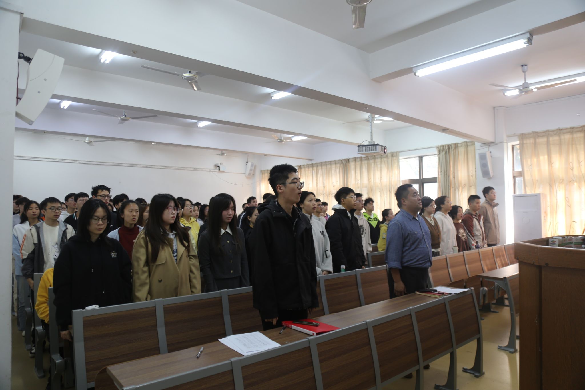开班仪式进行期间,全体参会人员起立,奏唱中华人民共和国国歌。随后,23级电子班新发展党员姚川森作交流发言,分享了从入党积极分子到正式党员的成长经历,勉励学弟学妹们坚持理论学习与实践锻炼相结合,不断提升综合素养,以实际行动争取成为合格的入党积极分子。