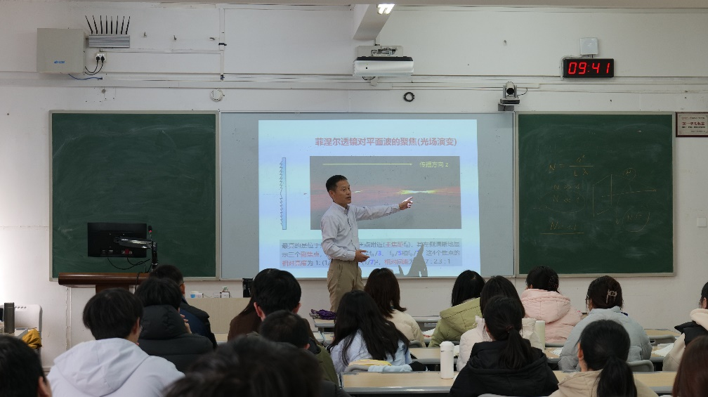 2025年11月18日上午,上海交通大学钱列加教授受邀来到我院,参加光学讲座和教学交流活动。授课环节由永利官网刘红荣院长主持。钱教授以菲涅尔衍射为切入点,循序渐进地带领同学们深入探讨了圆孔衍射、泊松亮点和索墨菲边界波等光学现象。他不仅讲解了光学原理,还分享了抑制近场调制的实用方案,并深入探讨了菲涅尔透镜在现代技术中的应用前景。钱教授的讲解幽默风趣、深入浅出,课堂气氛轻松愉快,让同学们感受到了光学的无限魅力。全体光学课程组教师、物理系与电子系部分青年教师参与聆听学习。