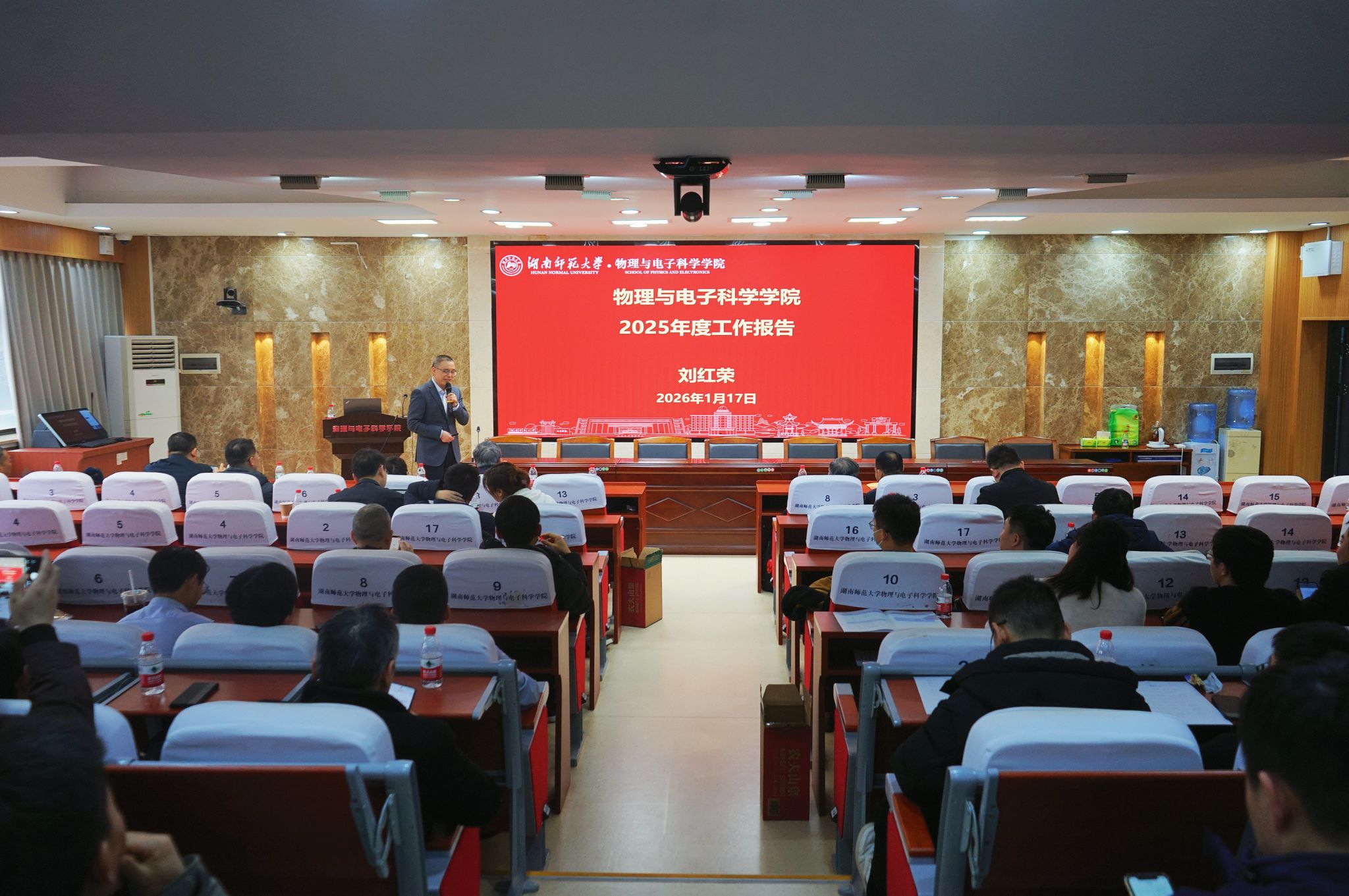 刘红荣从党建引领、人才队伍建设、专业建设、人才培养、科研成果、支撑保障与社会服务等方面对学院全年工作进行了梳理。他指出,过去一年学院各项工作在全体教职工的团结拼搏下取得了优异成绩,物理学专业高质量通过教育部师范类第三级认证,物理学科教师团队获第四批全国“黄大年式教师团队”荣誉称号,学院荣获湖南省高等教育(本科)教学成果奖一等奖。全年共获批国家自然科学基金项目12项,其中包含重大研究计划课题1项。获批国家科技重大专项(创新2030)课题1项、湖南省重大基础研究项目1项。横向科研与技术转化成果突出,特别是与益阳高新区共建的湖南未来光电技术研究院项目,彰显了学院服务产业的能力。全年技术合同成交额大幅增长,科技成果转化成效显著。