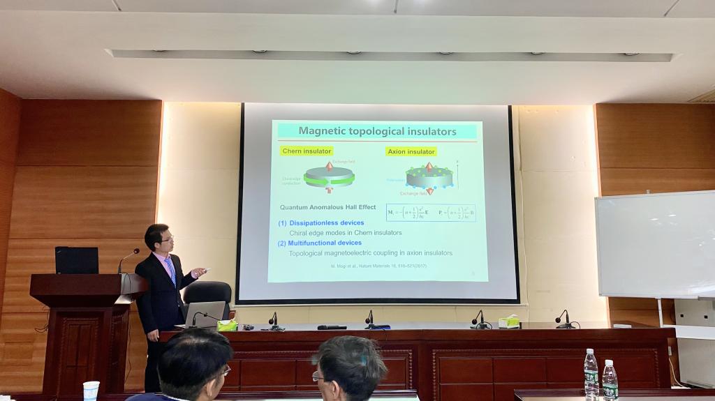 随后,中山大学侯玉升副教授给老师同学们带来了题为“Design robust quantum state in magnetic topological insulator”的讲座。侯玉升老师首先介绍了轴子绝缘体和陈绝缘体,并强调传统轴子绝缘体存在的弊端。接着,他着重讲解了自己工作——通过构建界面体系,实现了Bi2Se3等系列材料的轴子绝缘体。