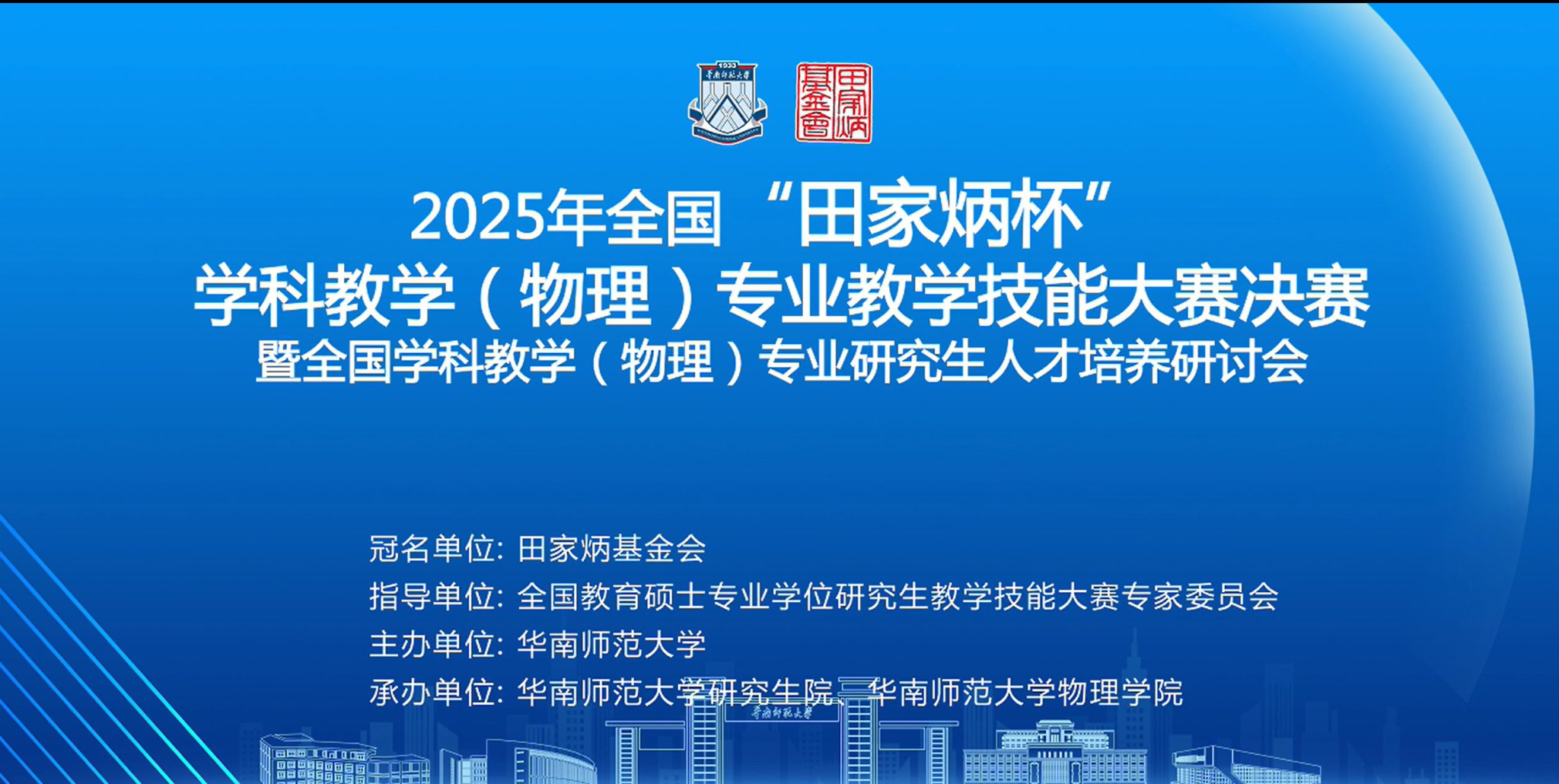 全国“田家炳杯”学科教学(物理)专业教学技能大赛由全国教育硕士教育指导委员会主办,目前是国内层次最高、规模最大、影响最广的全国性竞赛之一。比赛的初赛采用的是“教学设计+片段教学”通讯评审的形式,约前50%进入决赛。决赛采用“15分钟课堂教学+现场答辩”的形式,采取评委、选手双匿名模式,要求选手现场抽题并在120分钟内完成备课。